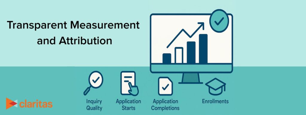 It’s not enough to know which ads were clicked; you need to know which efforts led to actual enrollment. Claritas provides advanced measurement and attribution tools to track outcomes like inquiry quality, application starts, application completions, and enrollments. AIO continuously optimizes based on these results, reducing wasted spending and focusing on strategies that truly work